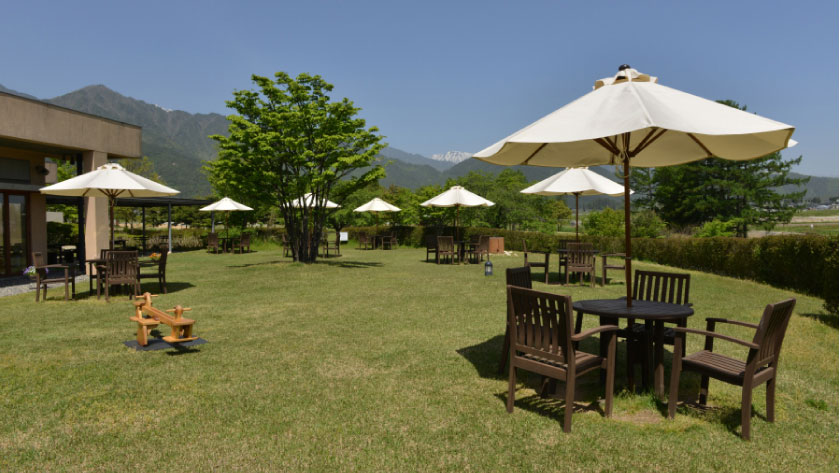 屋内外で楽しめるカフェです。ここ安曇野ちひろ美術館のある松川村産のりんごジュースは、とてもおいしいですよ。私の家族は訪れるたびに注文しています。松川村や安曇野市はりんごの産地としても有名です。