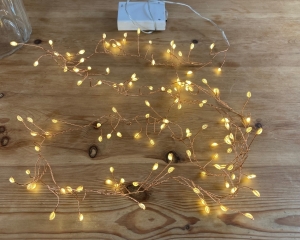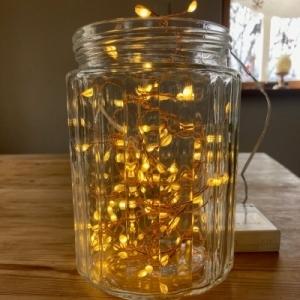 100円ショップのライトを使っています。全長1m程のLEDライトを入れてみました。電球色は落ち着いたいい色ですよね。とてもコスパが良い所がお気に入りです。