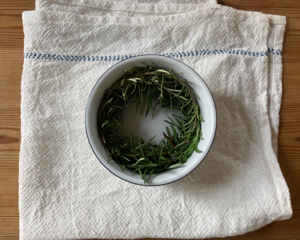 直径10㎝程の器にローズマリー2本を丸くなるように押し込みます。1点を掴み、ゆっくり器から取り出し、ワイヤーでぐるぐると巻きます。あとは気になった所をワイヤーで巻き付け丸くなるように仕上げるだけです。