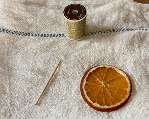 乾燥したドライオレンジに紐を付ける作業をします。糸と爪楊枝を用意しました。オレンジに爪楊枝で穴を空けます。そこに糸を通して結べば出来上がりです!