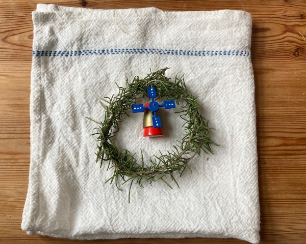 ローズマリーを使った直径10㎝程のリースです。簡単ですので、是非ご家族で作ってみて下さいね。