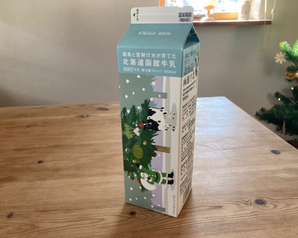 クリスマス仕様の牛乳です。可愛いので、手に取るたび笑顔になってしまいます。