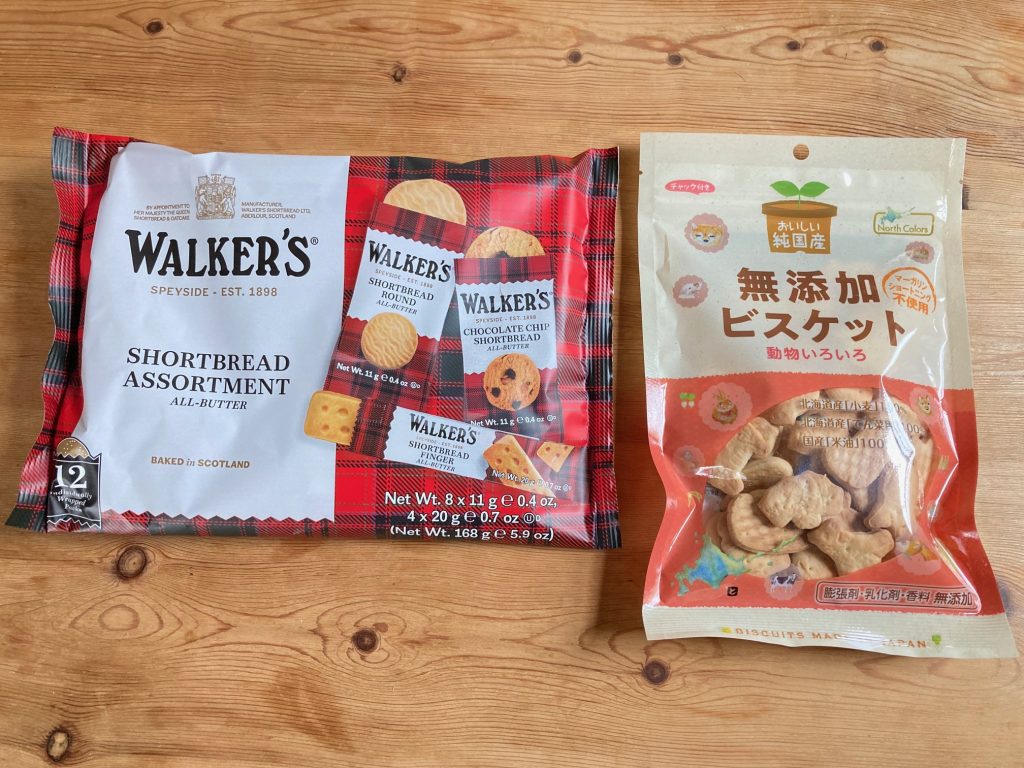 左のウォーカーのクッキーは小麦粉、バター、砂糖、食塩が使われています。